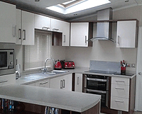 The light and airy open plan kitchen has high gloss doors, integral slimline dishwasher, fridge/freezer, microwave, oven and electric five ring ceramic hob with touch control. For casual dining there is a breakfast bar with two stools and for family dining there is the dining table and chairs. The open plan lounge is complemented with a modern lounge suite.
